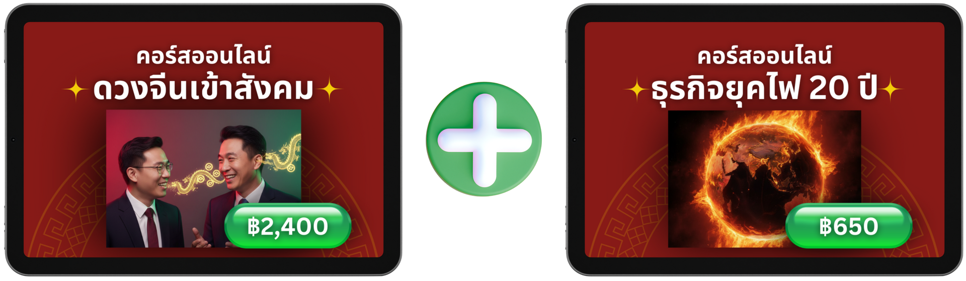 โปรพิเศษ ลดเพิ่มอีก 500 บาท เมื่อซื้อคอร์ส "ดวงจีนธุรกิจ" และ คอร์ส "ธุรกิจยุคไฟ 20 ปี" ในบิลเดียวกัน จาก 3,050 บาท เหลือเพียง 2,550 บาท